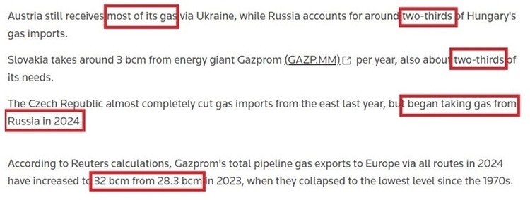路透社:2024年,俄罗斯天然气工业股份公司通过所有路线向欧洲出口的管道天然气总量从去年的283亿立方米增加到320亿立方米。如果乌克兰关闭输气管道,对于这些国家来说无疑是个大问题。