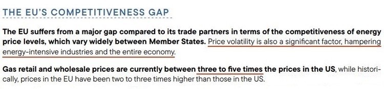 欧盟委员会此前发布的《欧洲竞争力未来》报告中提到了几大经济挑战,其中的首要挑战就是俄罗斯廉价能源的“消失”。