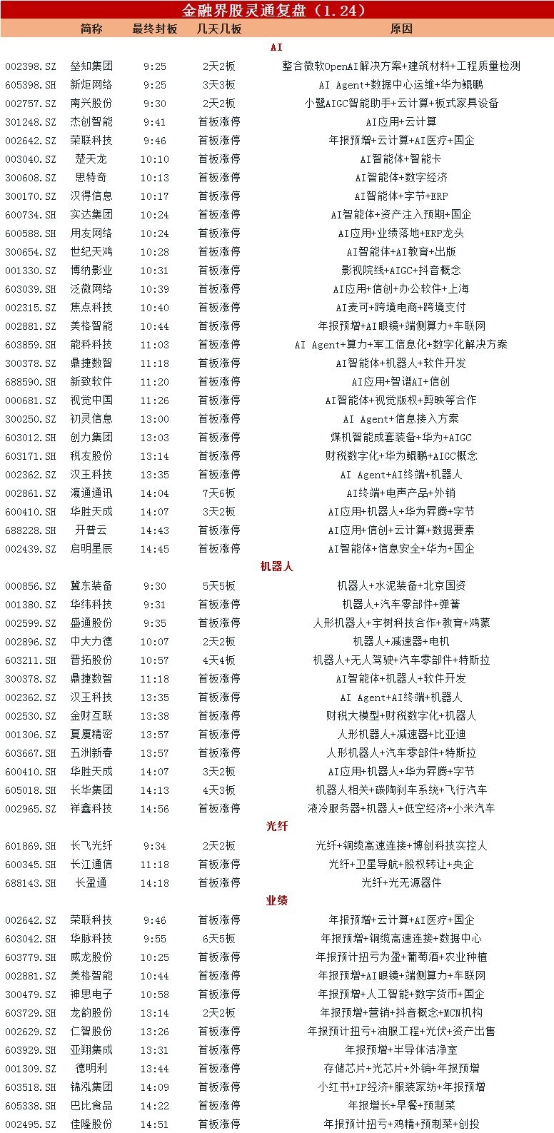 AI概念爆发,汉得信息、初灵信息、世纪天鸿等多股涨停。机器人概念股依旧活跃,冀东装备、汉王科技、中大力德等2涨停。
